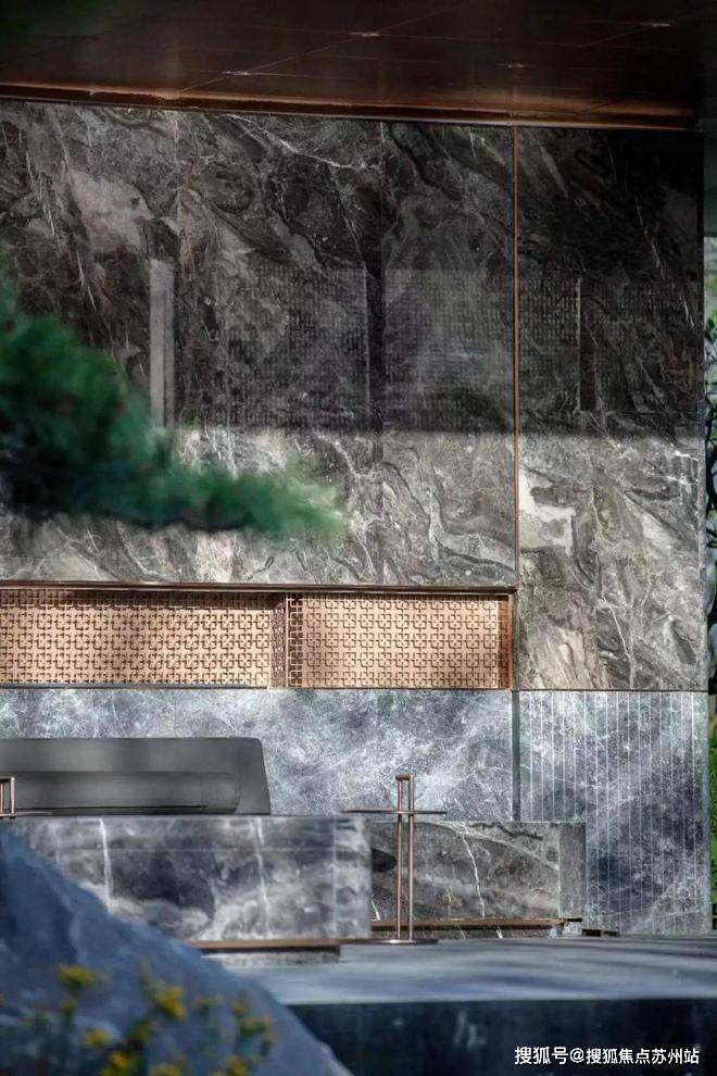 穿过连廊,就是位于社区中央的第二景观会客厅聆星客厅,立面装饰有极具典藏价值的威尼斯棕奢石、吊顶采用铝板切割镶嵌、地面采用阿尔卑斯灰和福鼎黑拼花铺装。